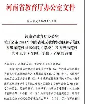 近日,河南省教育厅公布了2021年河南省社区教育试验区和示范区、省级示范性社区学院(学校)及省级示范性老年大学(学院、学校)名单,三门峡社区大学被河南省教育厅评定为河南省“示范性老年大学”。 三门峡社区大学是2015年依托三门峡广播电视大学成立的。自成立以来,遵循“增长知识、陶冶情操、...…