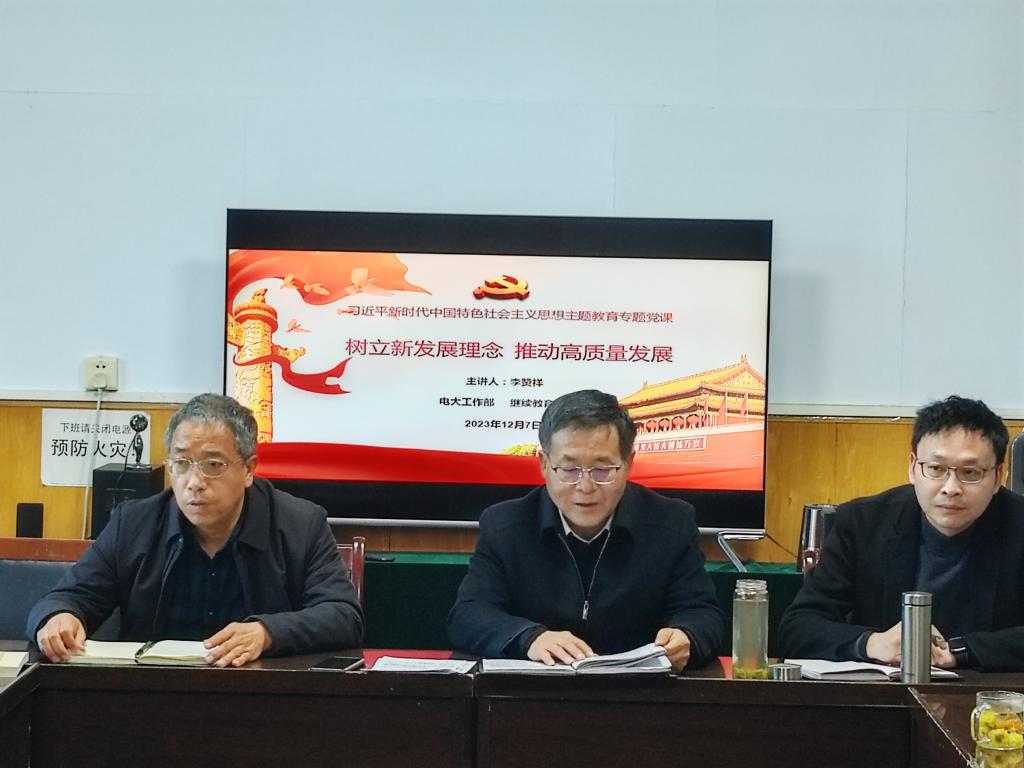 12月7日下午,正县级干部李赞祥以“树立新发展理念,推动高质量发展”为主题为电大工作部和继续教育学院全体教师讲授主题教育专题党课。